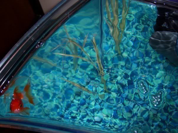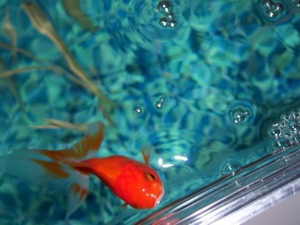 Since I'm in a dorm right now, I can't really bring my cats or dogs here (even though my neighbors have a kitten they hide..o_O)..But! I do have a fish. This is Fiddy, my oranda goldfish