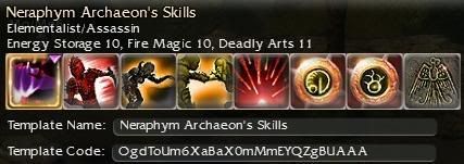 Basically, the premise of this build is to use powerful skills often that otherwise would take too long to recharge. Assassin's Promise (AP) recharges all these long-recharge skills as soon as the hexed target dies. If there's a group of targets clumped up, select the best one to kill (monk, ele, etc) and target it. Use Glyph of Sacrifice (GoS) followed by Meteor Shower (MS). Now you have rocks raining down on the group. Use Glyph of Immolation (GoI) and then cast AP on your main target. This will hex it and burn it. Follow this up with Ebon Vanguard Assassin Supporters (EVAS). Usually by now, you and your teammates will have killed that target, especially if it was a monk. If it's still alive, yell at it! Use "You Move Like a Dwarf!" (YMLAD) on it for some solid damage and a knockdown. (With MS and your Evas's Iron Palm, odds are the target will already be knocked down.) Once it's health is below 50%, use "Finish Him!" (FH), which usually kills most monsters. FH also gives the target cracked armor, making you Evas hit harder.
